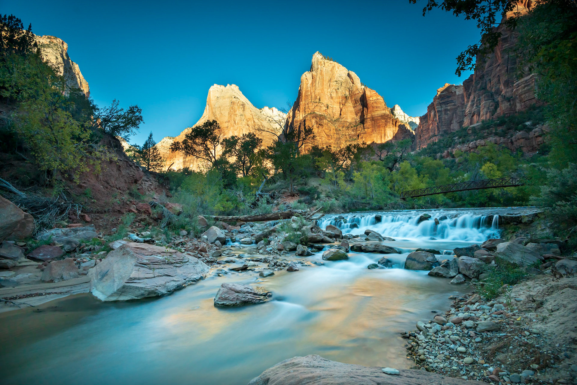 The Virgin River and The Watchman (1995 m) in the early morning on a crisp fall day. Zion National Park, Utah.